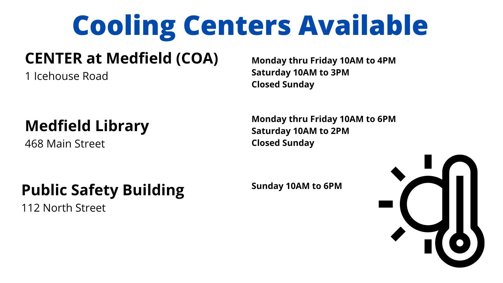 Due to the oppressive heat, cooling centers have been set up around town. Residents will be responsible for bringing their own food, water, and electronic devices/chargers.